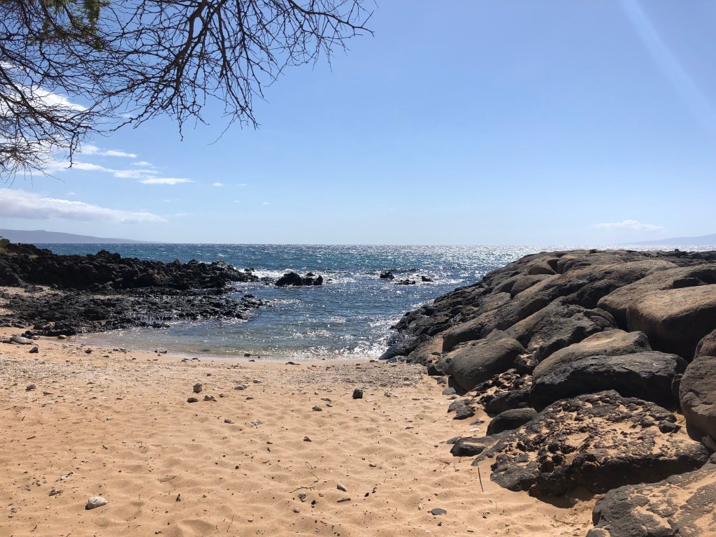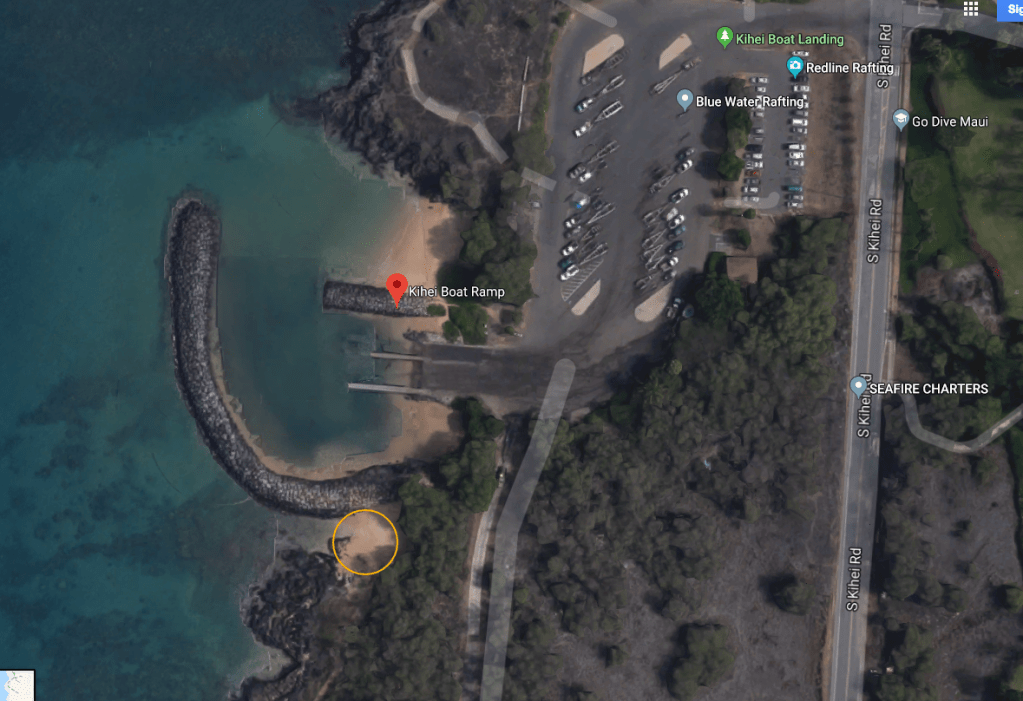 So far as I know it doesn’t have a name but it’s just south of the Kihei Boat Ramp/Landing. You actually pull into the boat ramp parking lot and then walk to the left by the water. The little cove is just on the other side of the boat ramp jetty (to the left / south). Here are some photos. Note that the photos use a wide angle lens so it’s smaller in real life.
