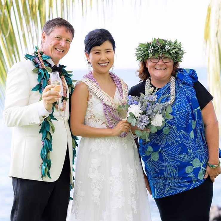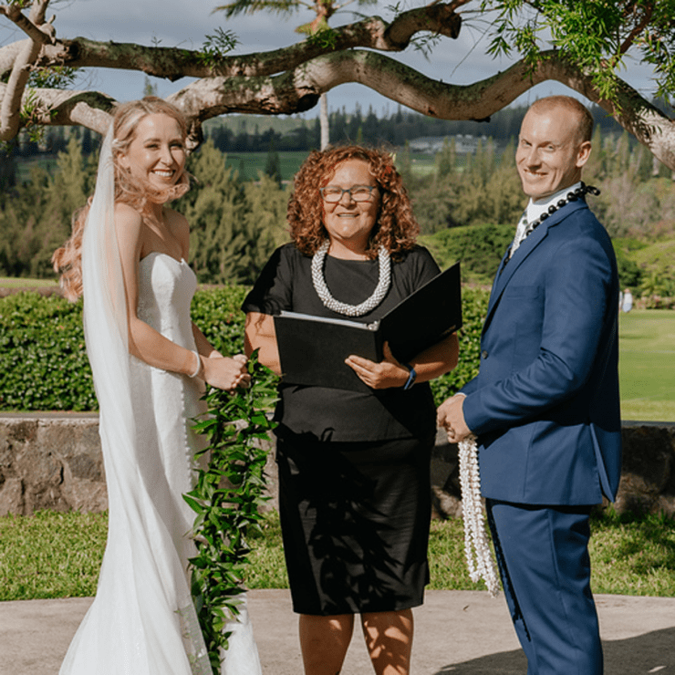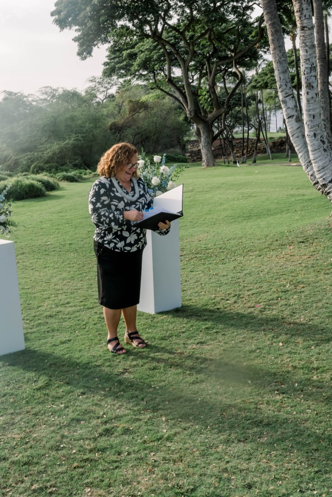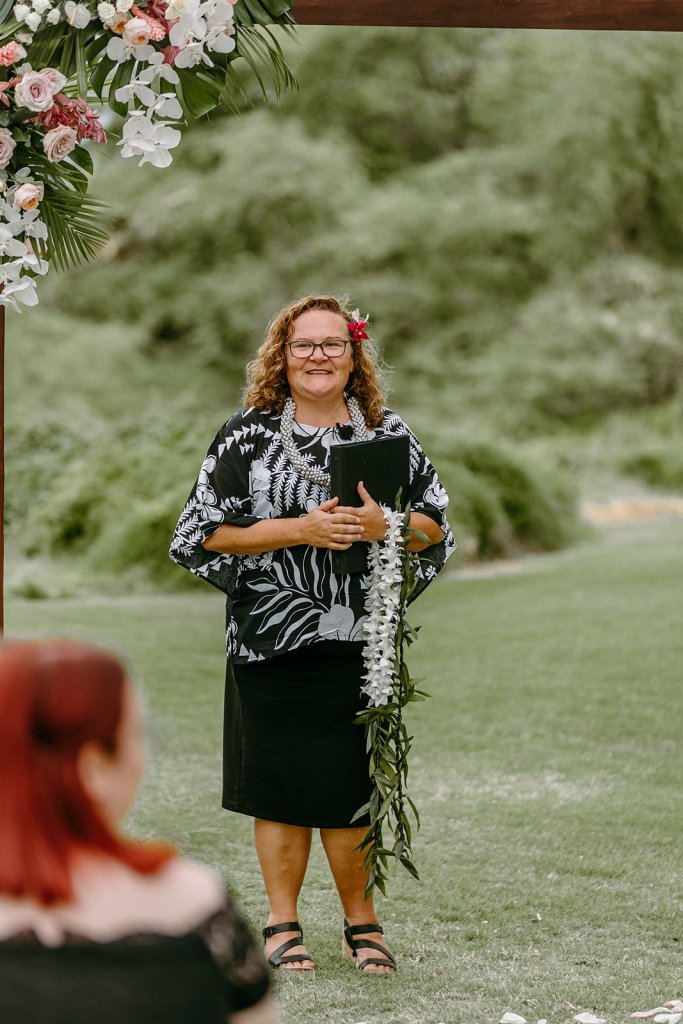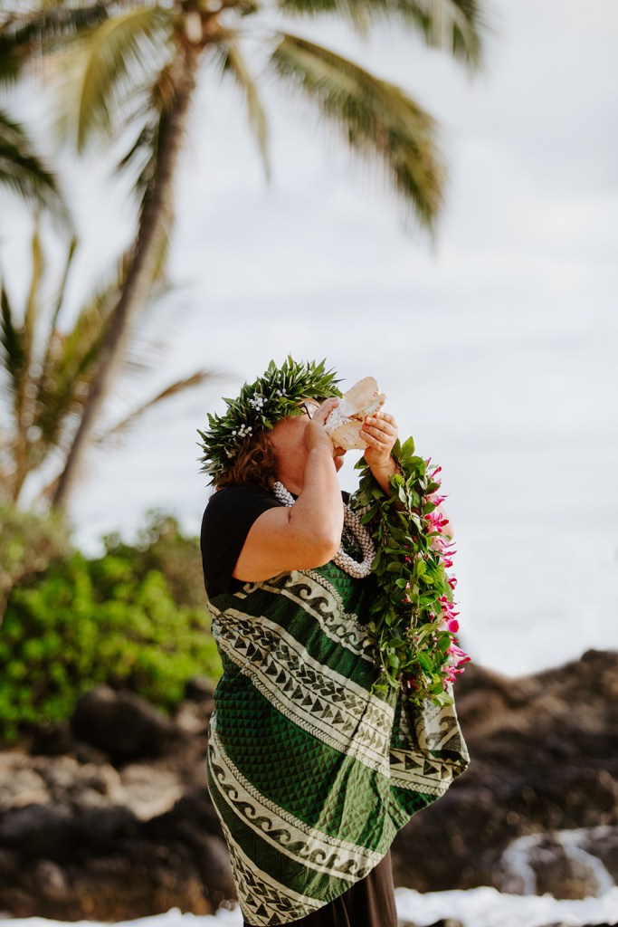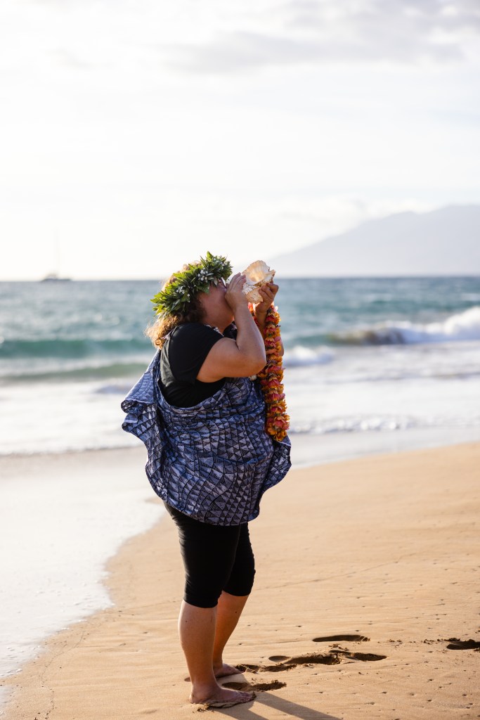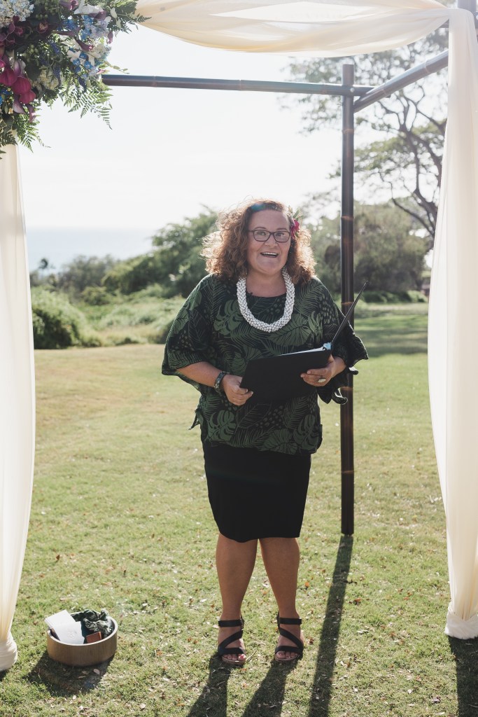 I can wear more traditional ceremonial garb, such as a kīhei, a cloak tied at the shoulder, over plain black clothing. Each kīhei print has been selected for the symbols because they are auspicious for a wedding or other sacred occasion. This is most common amongst Kahu (ceremonial celebrant – priest/ess). I have a deep respect for my host culture of Hawaii, so I wear ceremonial clothing with the blessing of my kumu (teachers) to honor the traditions of Hawaii.