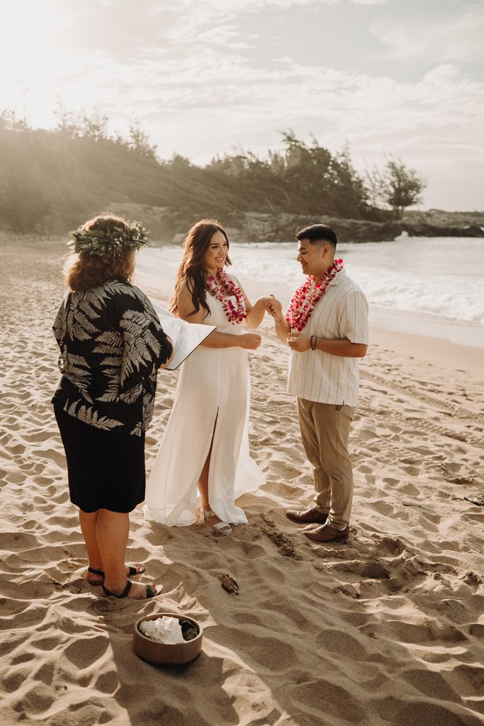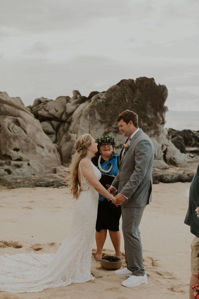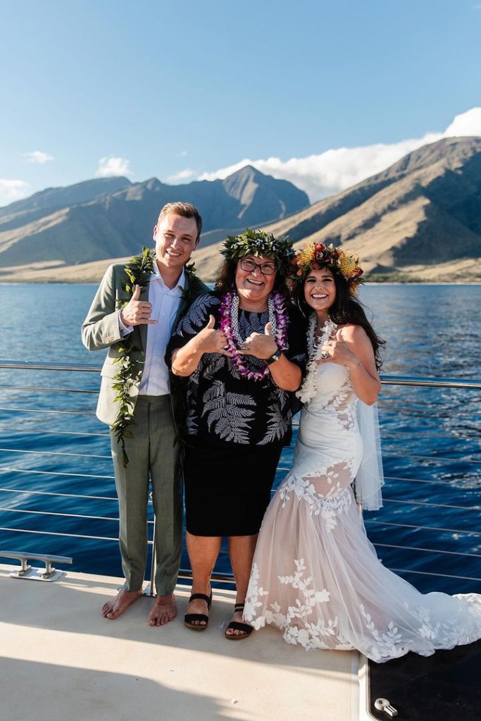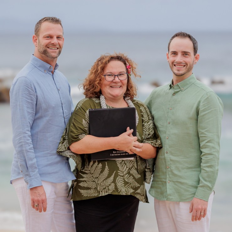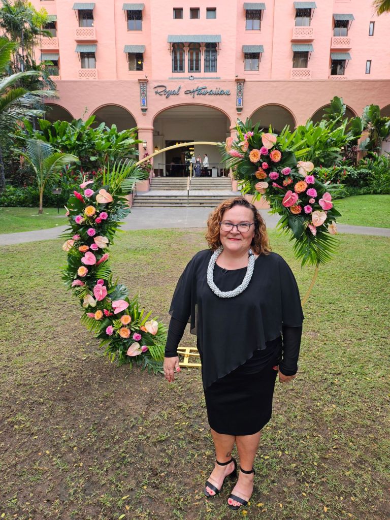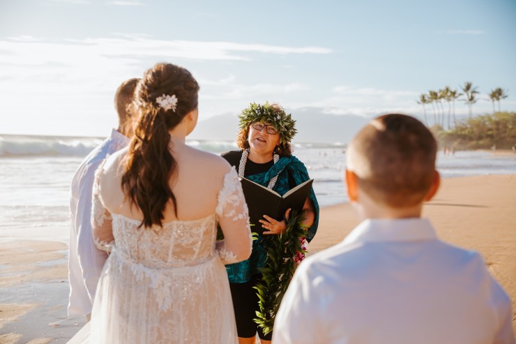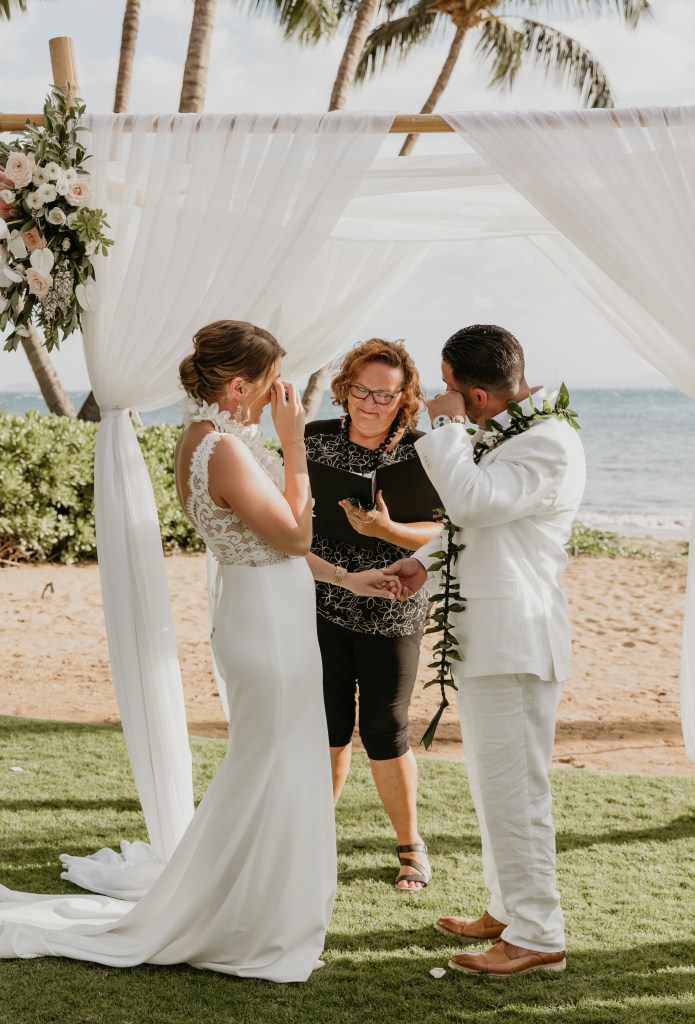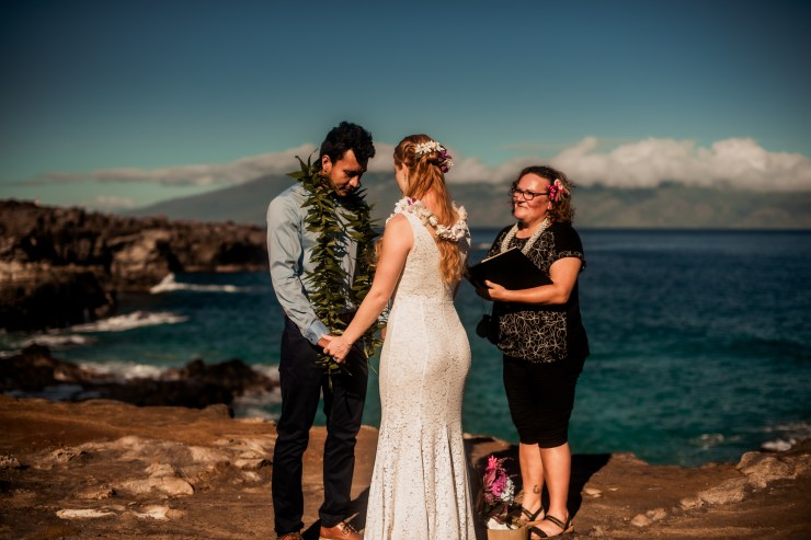 I can wear more traditional ceremonial garb, such as a kīhei, a cloak tied at the shoulder, over plain black clothing. Each kīhei print has been selected for the symbols because they are auspicious for a wedding or other sacred occasion. This is most common amongst Kahu (ceremonial celebrant – priest/ess). I have a deep respect for my host culture of Hawaii, so I wear ceremonial clothing with the blessing of my kumu (teachers) to honor the traditions of Hawaii.